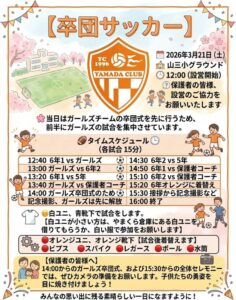 🌸🌸卒業オメデトウ~🌸🌸 2026年3月18日 最終更新日時 : 2026年3月18日 yamadaclub 26名の男子、8名の女子が卒業します~山くらで思う存分サッカーを楽しみ!笑顔で巣立っていきます~君たちが与えてくれた、沢山の夢!と感動!本当に有り難う!!